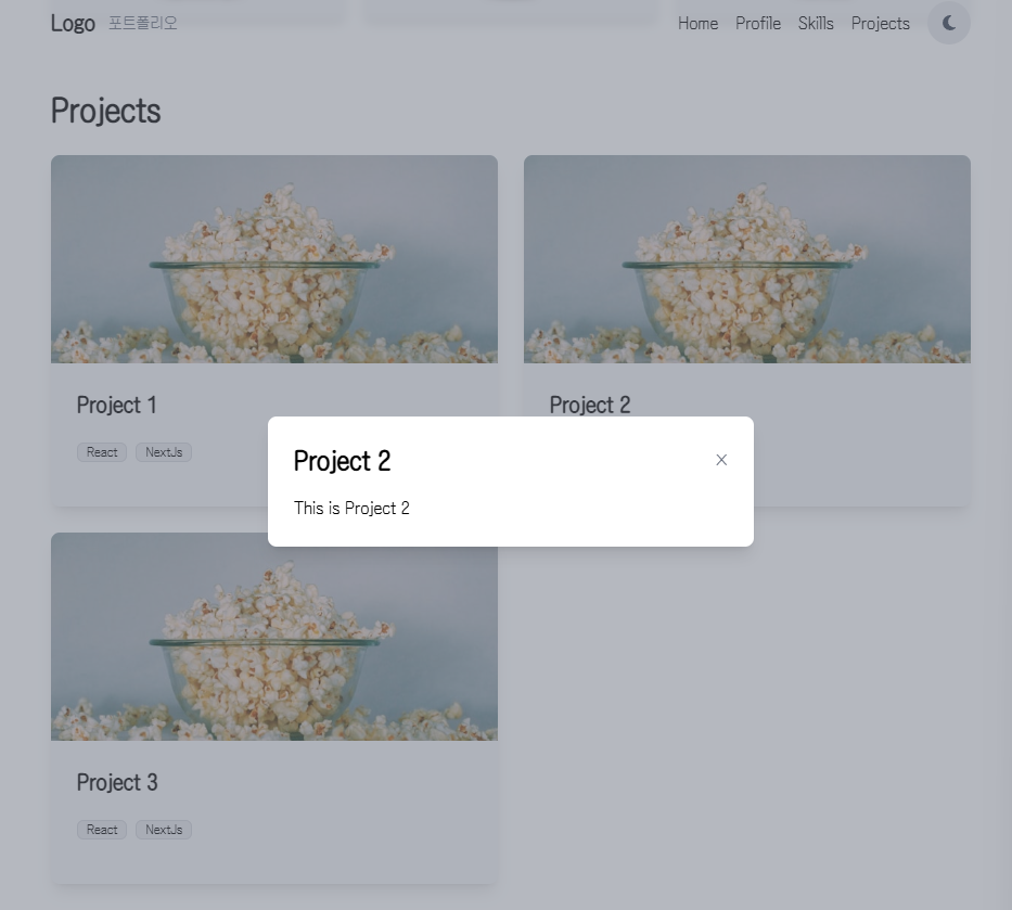 각각의 카드를 만들고 project의 id에 해당하는 모달이 열릴 수 있도록 구현했다.